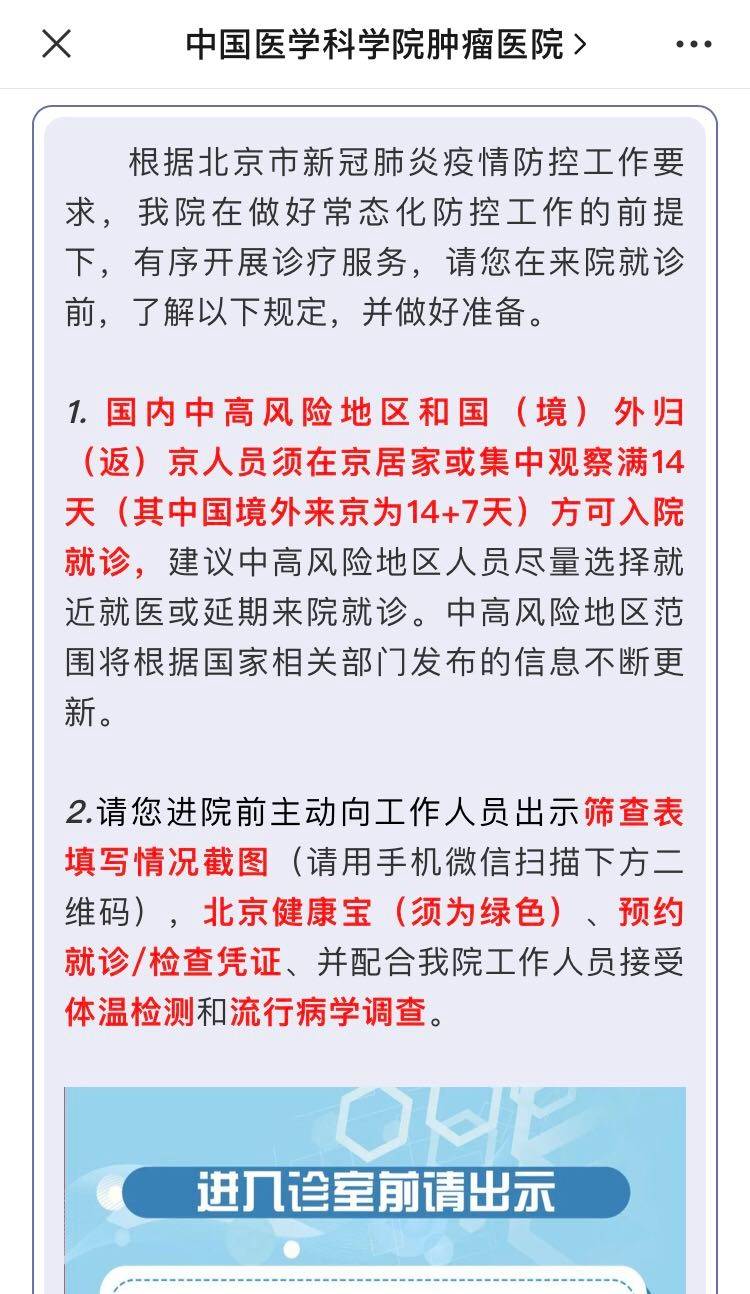 “我们在14日上午10: 30左右接到通知,被紧急送往医院。突然之间,我到了医院才知道。我让我们给将于15日、16日和17日来医院的病人逐一打电话,并建议他们推迟就诊时间,在来医院之前等待14天。”中国医学科学院肿瘤医院的一名匿名工作人员告诉《健康时报》。