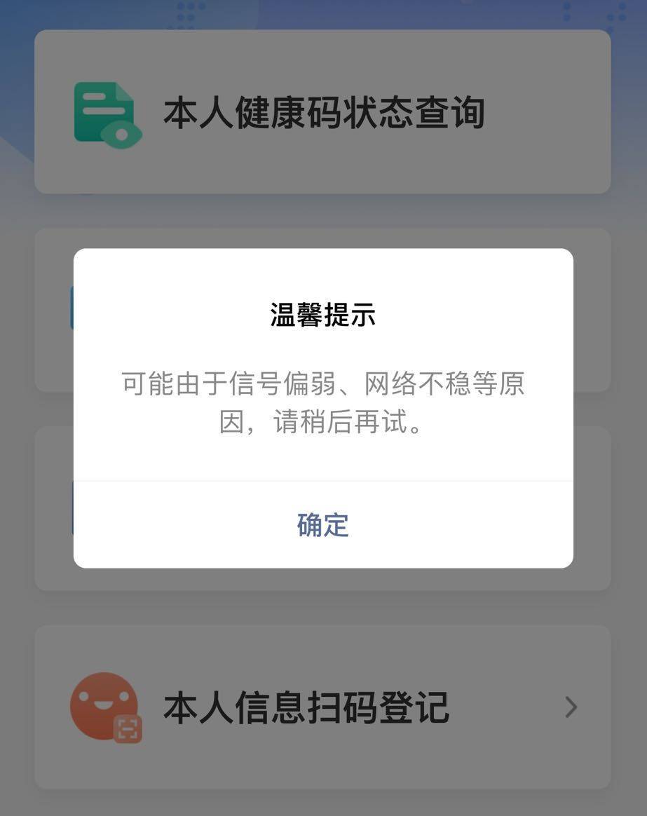 今天早上,故障主要出现在健康宝的微信端口。打开北京健康宝微信后,“加载”状态会明显比平时慢。当询问我的健康状况时,我会弹出一个窗口说“可能是信号弱,网络不稳定,请稍后再试”。记者在多种网络环境中尝试,但同样的提示仍然出现。