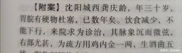 沈阳城西龚庆龄,三十岁,胃脘有硬物堵塞,已经好几年了,饮食减少,感觉吃什么东西都“不能下行”,张锡纯给他诊脉,其脉象沉而微弦,右边尤其如此,张锡纯认为这是他的胃中有积,胃气难以下行,所以阻塞了气机的下降,于是,张锡纯开方子,鸡内金一两、生酒曲五钱,一共就两味药。结果是服了几剂以后,硬物全消,好了。